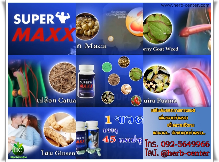 Super Maxx ซุปเปอร์แม็กซ์ เป็นผลิตภัณฑ์อาหารเสริม บำรุงร่างกาย เสริมสมรรถภาพ ให้แก่ท่านชาย ทีีใช้แล้วได้ผลดีมากเมื่อเทียบกับตัวยาอื่นๆ ในตลาดของประเทศไทย ที่เกี่ยวกับการเพิ่มสมรถถภาพ ตัวนี้คือพระเอกครับ อันเนื่องมาจากผลิตภัณฑ์ SuperMaxx (ซุปเปอร์แม็กซ์) ได้รับการวิจัยและพัฒนาขึ้นโดย ผู้เชี่ยวชาญจากต่างประเทศ ในสถาบันวิจัยแล็ป Professor William Lamb,MD. ซึ่งเป็นสถาบันในการทดลอง ทดสอบ ที่มีความชำนาญการในการ จัดหาตัวยา หรือสมุนไพรที่มีผลในการบรรเทาอาการหย่อนสมรรถภาพในชาย มามากกว่า 40 ปี และเป็นที่น่าเชื่อถืออันดับหนึ่งในแถบทวีปอเมริกา และเอเชียตะวันออก จากผลการวิจัย ผนวกกับการทดลอง ให้ผลเป็นที่น่าพอใจ เพราะสามารถช่วยในการบรรเทาอาการไม่แข็งตัวของอวัยวะเพศชายในผู้ป่วยมากกว่า 100,000 คน ที่มีปัญหาทั้งในด้านการแข็งตัวไม่เต็มที่ และการไม่แข็งตัวเลย ให้กลับคืนมามีสุขภาพพลานามัย แข็งแรง สมบูรณ์ สมรรถภาพทางเพศ กลับมาใช้งานได้ดีอีกครั้ง