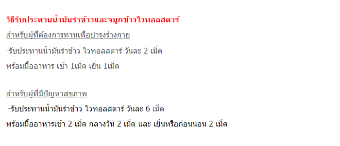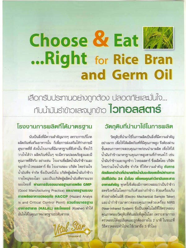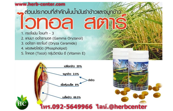 น้ำมันรำข้าว Vital Star ไวทอลสตาร์ aimstar(เอมสตาร์) เป็นน้ำมันจมูกข้าวอาหารเสริมเพื่อบำรุงสุขภาพร่างกาย ซึ่งเป็นน้ำมันรำข้าวยี่ห้อเดียวที่สกัดภายใน 24 ชั่วโมง มีสรรพคุณและประโยชน์มากมาย (จากการศึกษาวิจัยค้นคว้าพบว่า สาร Gamma Oryzanol ในรำข้าวและจมูกข้าวนั้น จะสลายตัวไปหากขัดสีข้าวแล้วเกิน 24 ชั่วโมง ดังนั้นจึงต้องใช้รำข้าวสดที่เก็บไว้ไม่เกิน 24 ชั่วโมง) และเป็นน้ามันรำข้าวยี่ห้อเดียวที่ญี่ปุ่นยอมรับ จึงมั่นใจได้ว่าปราศจากสารตกค้าง ผลิตภัณฑ์คุณภาพมาตรฐาน World Class ที่ได้การรับรอง มาตรฐานการผลิต GMP มาตรฐานระบบการผลิตอาหารปลอดภัย HACCP มาตรฐาน อาหารฮาลาล (HALAL) และโคเซอร์ (Kosher) ขึ้นทะเบียนรับรองจากองค์การอาหารและยา กระทรวงสาธารณสุข